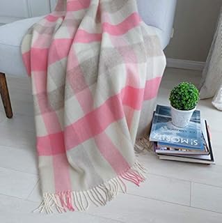 Linen & Cotton Couverture Douce et Légère Plaid a Carreaux Olivia - 100% Laine Merinos, Beige Naturel Blanc Rose (140x 200 cm) Couverture Chauffante, Jeté de Canapé, Couvre Lit Polaire pour Sofa Hiver
